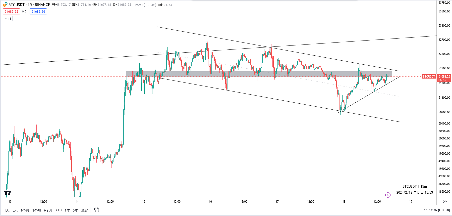 BTC:大饼在52000左右开始回调短期已见顶, 中长线没有见顶迹象。昨天开始回调,今天反弹之后需要观察能否横盘整理,回调的话可能会到 49000~50000 左右。回调止跌之后可以找机会入场。压力位:52000、53000。支撑位:50000、49000。