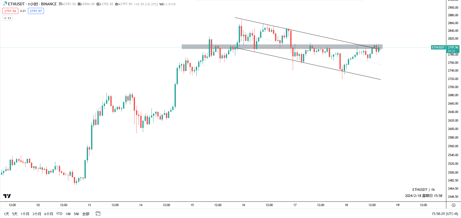 ETH:昨天已经开始回调,今天反弹之后需要观察能否横盘整理。支撑位:2700、2600,压力位:2800,3000。