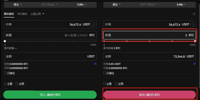9、输选择[全仓/逐仓]、[USDT保证金]、[杠杆倍数]、[限价委托] 一 输入[价格]、[数量] 或者[金额],点击[卖出(做空)BTC]一[确认]。