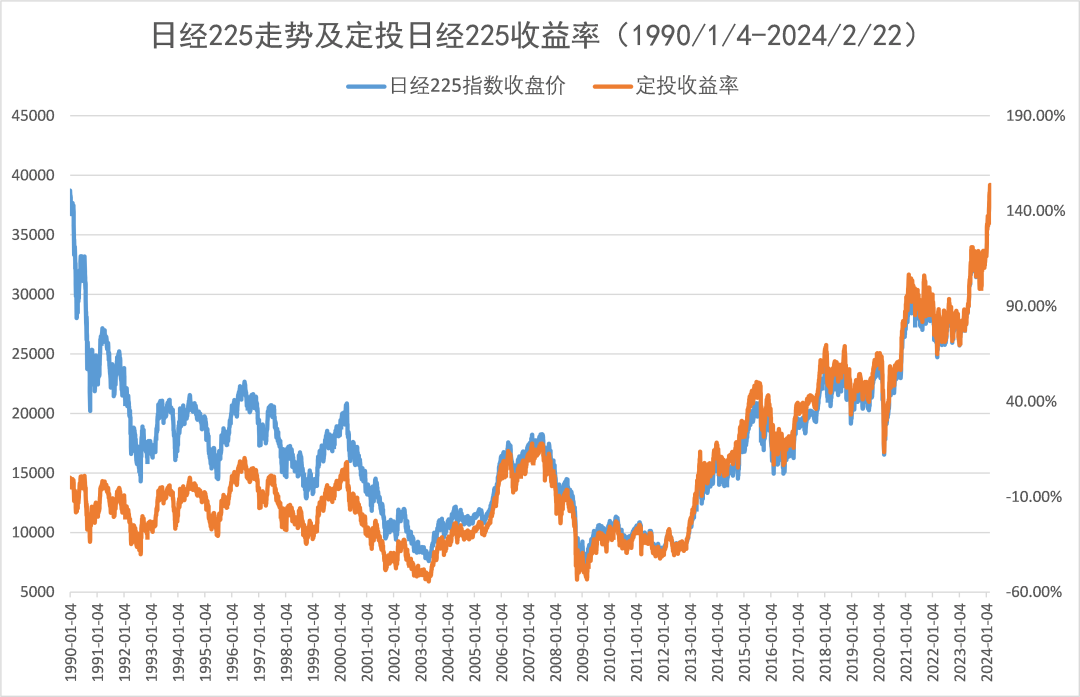 注:将日经225模拟为基金进行测算,每期扣款金额为1000元,首期扣款日为1990年1月4日,定投截止日为2024年2月22日,期间每月1号为定投扣款日,定投收益率=[(sum(每期定投金额/每月月初收盘点位)*期末收盘点位)/(sum(每期定投金额*投资期数))]-1。计算区间定投年化收益率为2.84%。利用指数对定投的模拟不代表真实收益,也不作为对未来收益的保障。