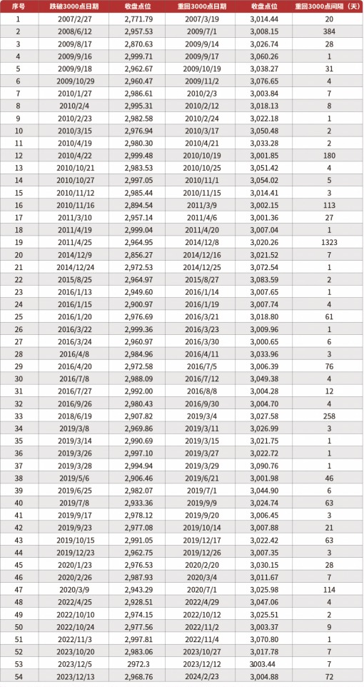 回顾沪指前54次从跌破3000点到收复3000点,平均用时56天,中位数用时6天。
