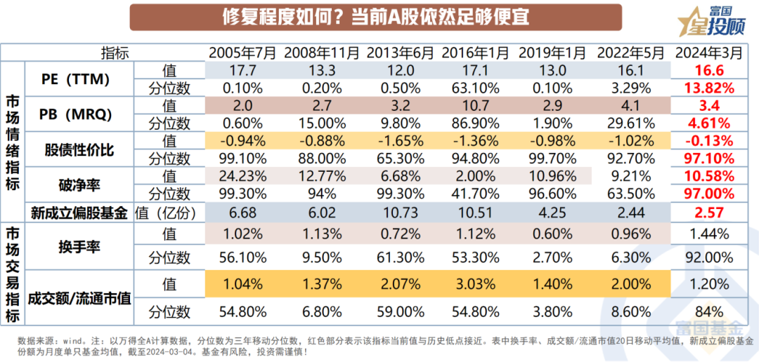 在投资中,“好资产”和“好价格”同等重要。在经历了快速的反弹后,交易层面A股已实现了短周期的修复。然而,从情绪指标看,无论是PB、PE估值,抑或是股债性价比、破净率等维度,A股情绪仍然低迷,且足够便宜。