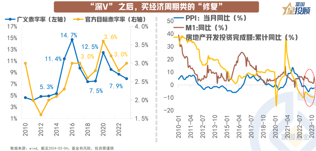 **广义赤字率在经过三年的收缩后,大概率进入到平稳过度,或者扩张的区间。在此背景下,财政政策对投资的拉动,或有利于经济周期类标的的修复。需要注意的是,经济周期类标的需要等待PPI、地产投资或M1等指标出现拐点或预期的修复,当前M1已走出底部,PPI和地产投资仍在走出底部的路上。
