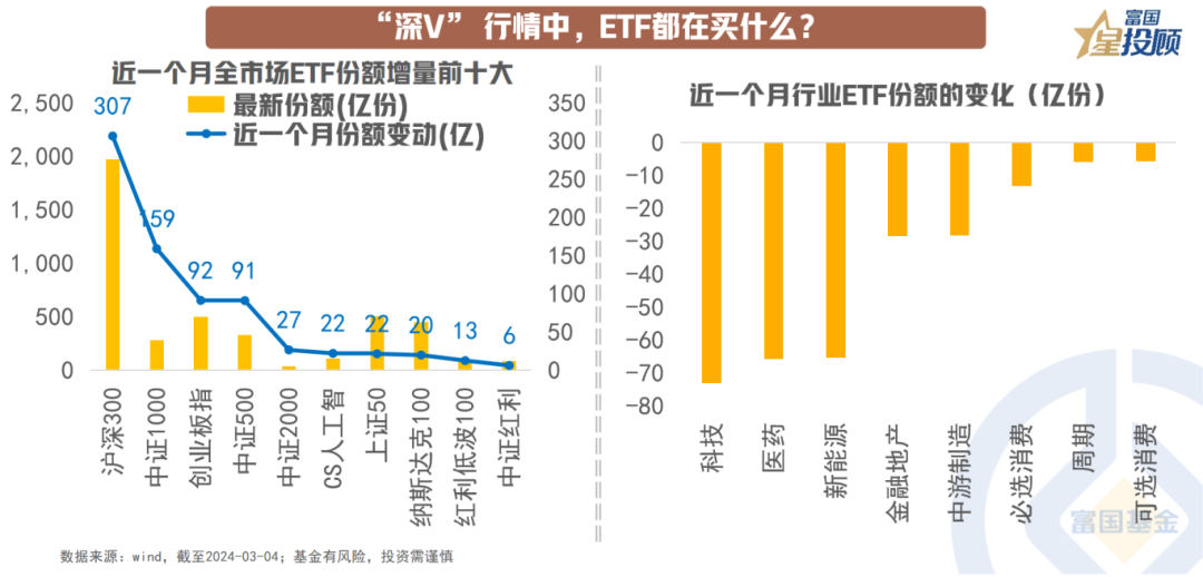 聪明资金在“深V”行情中,已经在表达自己的态度。在估值偏低的市场中,宽基指数有更大的确定性。最近一个月中,**场ETF中“买宽基”成为一种潮流,沪深300、中证1000、创业板指等指数受到资金的青睐。然而在资金腾挪的过程中,行业主题ETF由于投资者认为市场方向不明,整体上呈现净流出的状态。