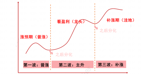 回顾这两轮结构牛市,可以分为三个阶段,**波是普涨,第二波是主升,第三波是补涨。