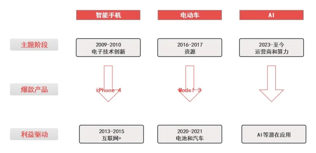 浙商证券回顾了2010年以来的三轮新兴产业周期——智能手机、电动车和AI。
