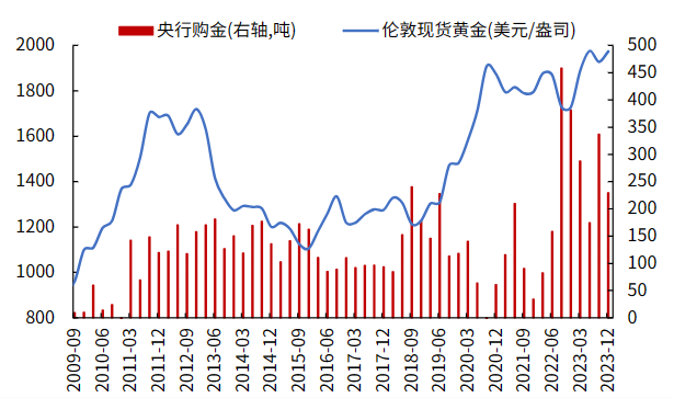 其中,美债实际利率是黄金短期定价的锚,金价与美债利率呈反向变动关系。而逆全球化背景下,地缘冲突频发、美元信用体系的摇摆,推动各国央行持续购金,全球央行购金规模在2021-2023年明显增长,各国央行积极增持主要出于规避信用货币风险、储备资产多元化等考虑,成为金价中长期维度内的支撑。