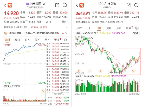 在消息利好下,港股小米集团大涨超11%,其他科技巨头快手、腾讯、小鹏汽车、哔哩哔哩等港股纷纷跟涨。