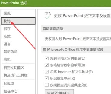 在弹出“PowerPoint选项”窗口左边区域,选择“校对”项。