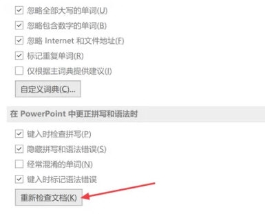 **在右侧“校对”面板中,点击“重新检查文档”按钮。