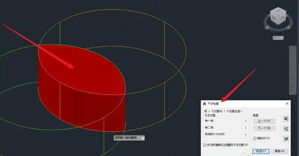 确认后,软件会跳出检测结果。如图所示。相交叉的部分已经标识出来,在检测对话框中,如果有多个干涉对象,可以一个一个的查看。