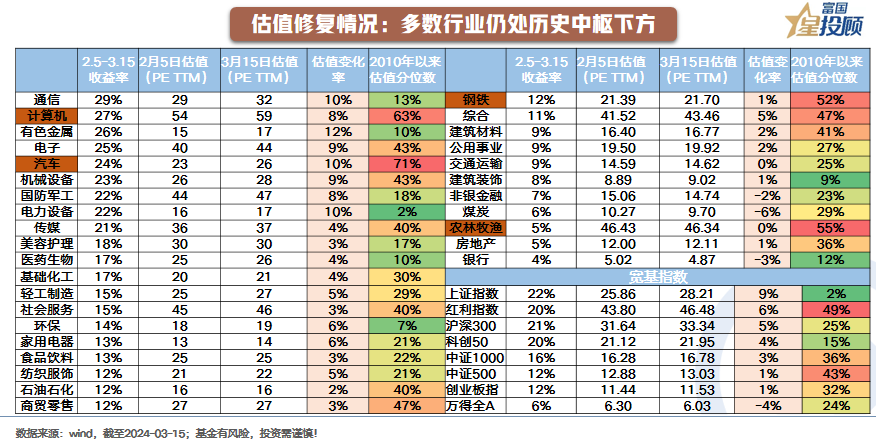 从行业层面来看,31个申万**行业中,9个行业涨幅在20%以上,13个行业涨幅在10%-20%之间。整体而言,始自于春节前的反弹幅度确实相对可观。但从估值层面来看,上述所有宽基指数估值仍处于历史**下方。行业层面,除却计算机、汽车、钢铁、农林牧渔,其余行业估值均处于 50%分位数下方,且17个行业估值分位数在30%以下,即比历史上70%的时间便宜。