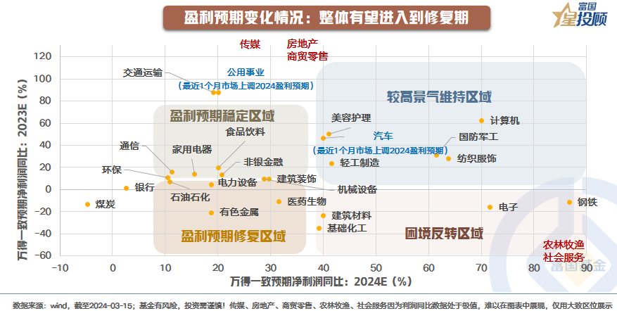 具体可以分为4个部分:一是,困境反转区域,即2023年业绩较差,2024年有望得到较好修复。典型代表是电子,修复的预期则源于下行2-3年的产业周期有望回升;二是,较高景气维持区域,即去年和今年业绩均有望保持不错的行业,如汽车(主要是零部件)、计算机等;三是,盈利预期修复区域,即去年业绩较差,今年有望得到**修复的部分。如医药、新能源等;四是,盈利预期相对稳定的区域,典型代表是消费。