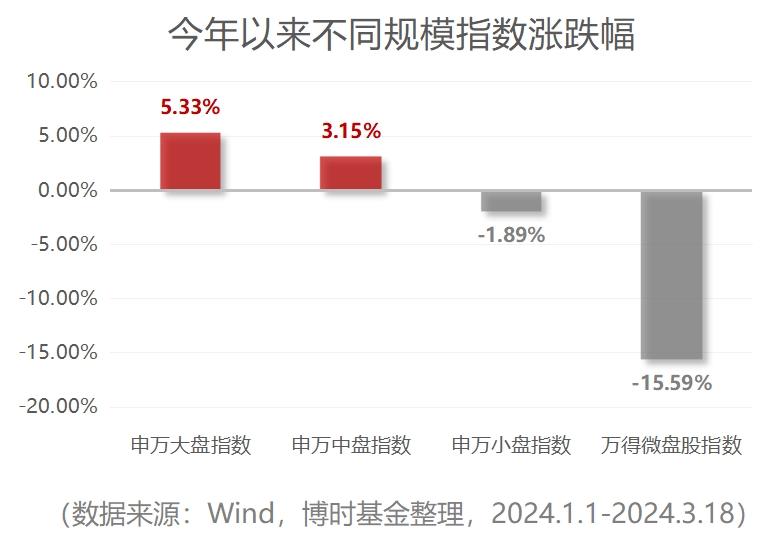 从不同规模指数今年的表现来看,微盘股不同于2023年的强势,在今年出现了较大幅度的回调,跌幅超过15%。而大盘风格今年表现相对突出,今年上涨5.33%。与之相应的,规模较大的基金往往在本**盘风格占优的行情下快速回血,而曾经“以小为美”的迷你基金失去了过往的优势。