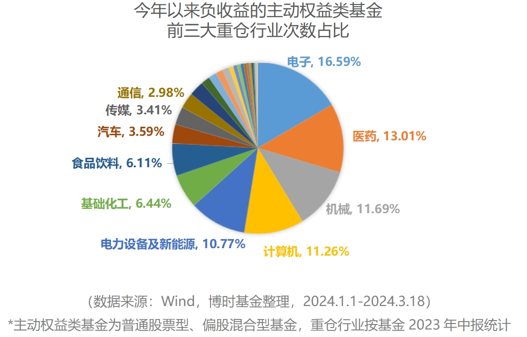 从行业风格上看,按去年各基金中报公布的行业配置进行统计,今年以来仍是负收益的权益基金,其前三大重仓行业主要分布在电子、医药、机械、计算机、新能源、基础化工、食品饮料等领域。