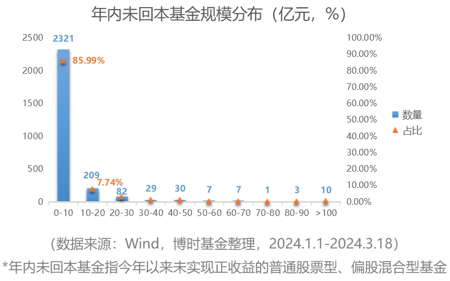 从规模效应上看,年内未回本基金大多为规模在10亿元以下的“迷你基”,占比近86%。此外是规模为10亿-20亿元的基金,占比7.74%。