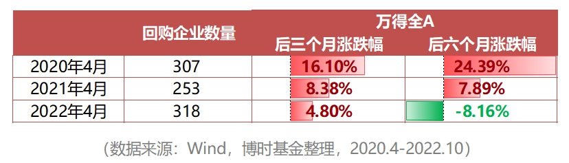 而根据以往经验,回购预案转换为实际回购行为的时滞一般为3-6个月。观察以上这三个时点往后3个月、6个月万得全A的涨跌幅,A股后续确有出现反弹行情。
