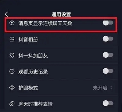 4.在通用设置页面里有一个“消息页显示连续聊天天数”,在它的后面点击对应的开关按钮,把按钮设置为彩色状态时代表已开启该功能。