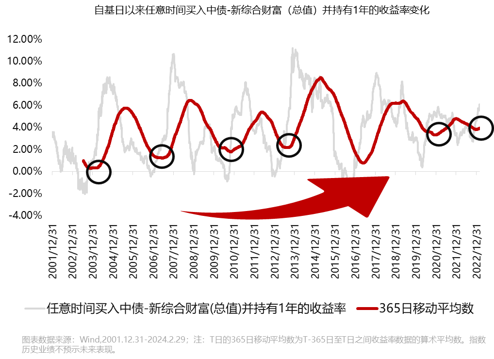 接着,我们以中债-新综合财富(总值)指数来刻画债市行情,用同样的方式进行测算,投资债市的收益曲线虽然也出现上下波动的特征,但整体似乎在逐渐抬升。