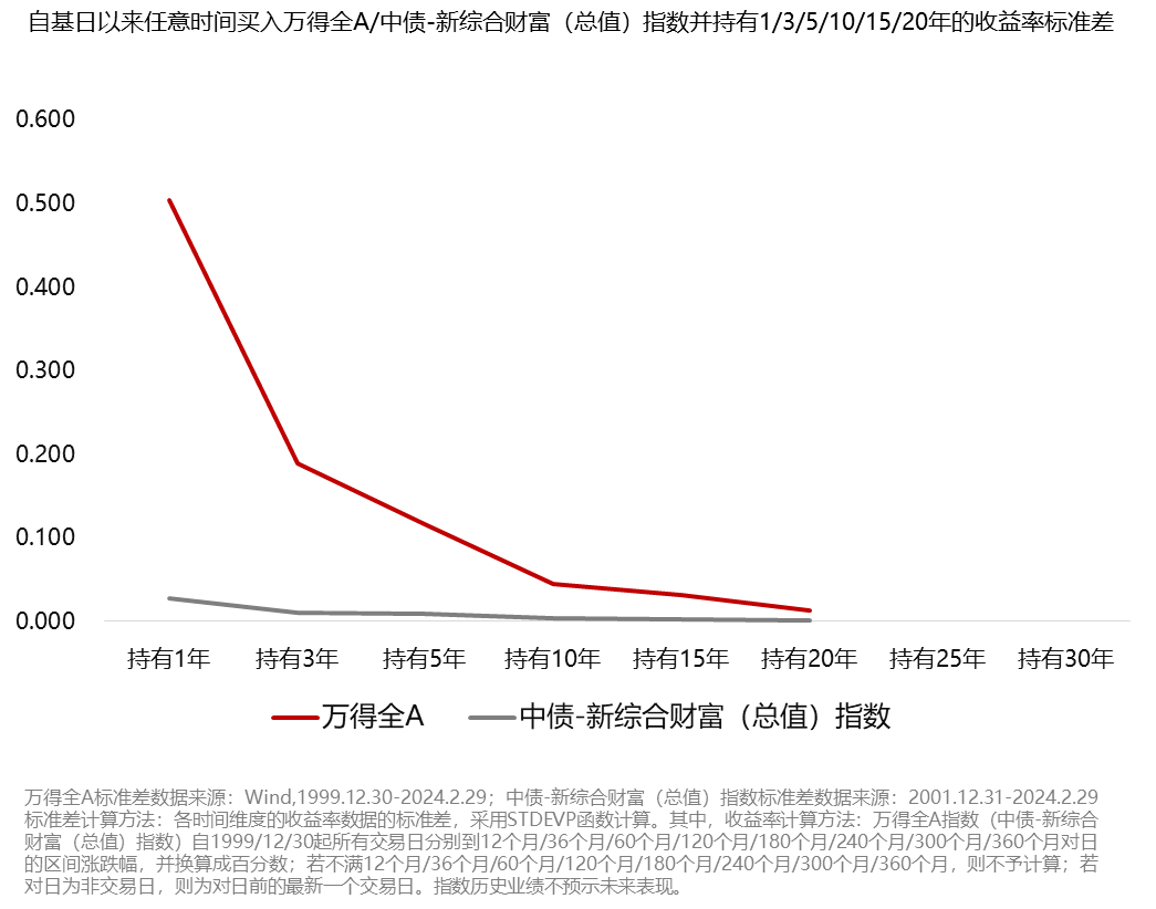 我们以持有不同期限下年均投资收益率的标准差,来定义风险,分别测算股市和债市中的投资风险。