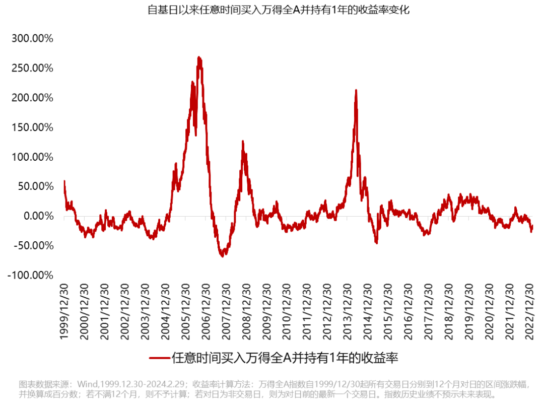 我们以万得全A来刻画股市表现,测算了自基日以来任意时间投资股市并持有一年的收益变化曲线。结果发现:随着入场时间的不同,收益率呈宽幅波动,但总会回归到某一**位置。