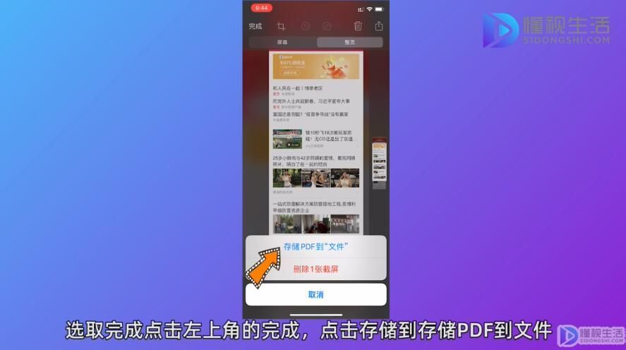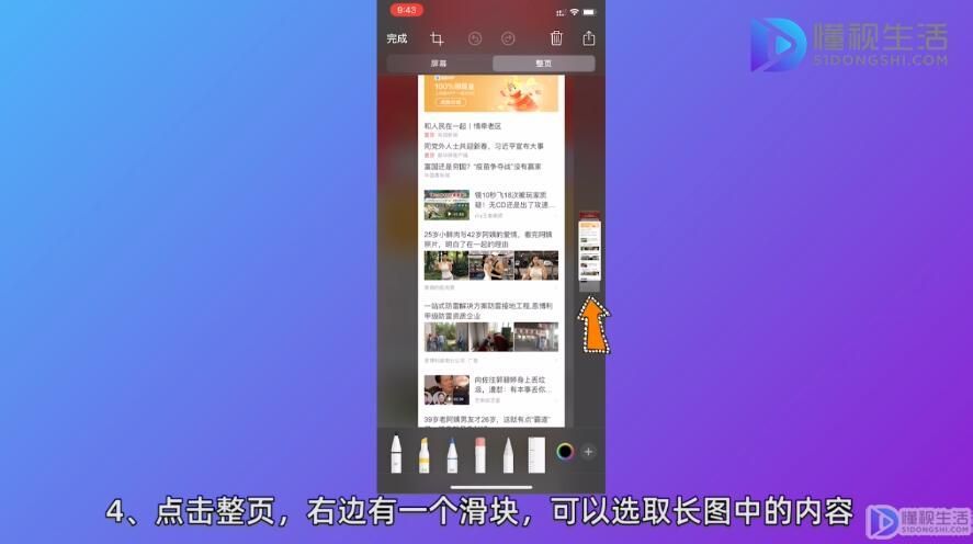 3、会看到屏幕和整页两个选择,屏幕就是普通的截图,整页就是截取长图了,点击整页,右边有一个滑块,可以选取长图中的内容。