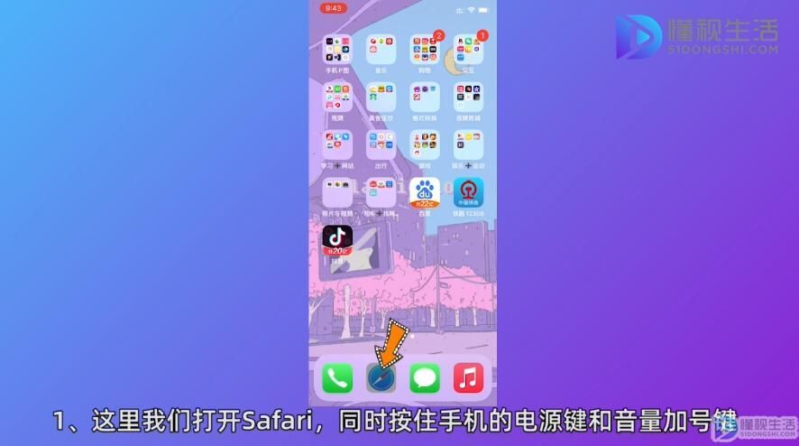 1、打开Safari,同时按住手机的电源键和音量加键。