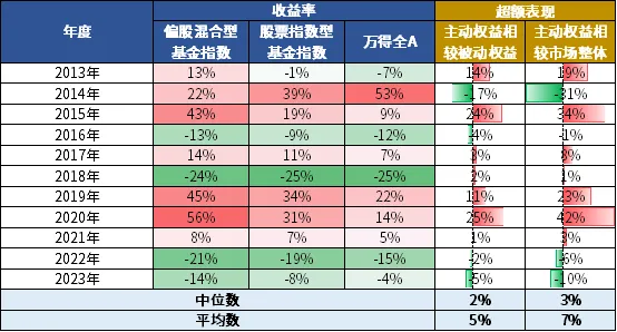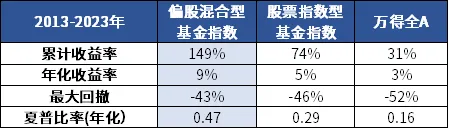 来源:Wind,主动权益基金测算采用万得偏股混合型基金指数,被动权益基金测算采用万得股票指数型基金指数,统计区间2013年-2023年。指数历史走势不预示未来表现,不代表基金产品收益。