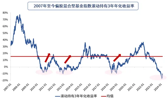 来源:Wind,测算采用万得偏股混合型基金指数,指数基日为2003-12-31,3年**年化收益数据从2007年起算,截至2024-3-6。指数历史走势不预示未来表现,不代表基金产品收益。