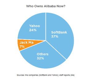 雅虎24 软银36.7 阿里·39.3 淘宝和猫店年营业额两千四百万。在米国上市后市值2000亿美元。