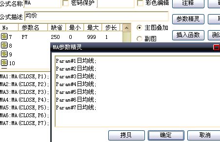 k 线图状态下,右键单击任意一条均线,选择修改指标公式,均线设置中7的参数名改为P7,缺省(跟以上天数不同),**,**等都设置好,下面的公式中增加MA7:MA(CLOSE,P7);之后测试公式,通过后确认。