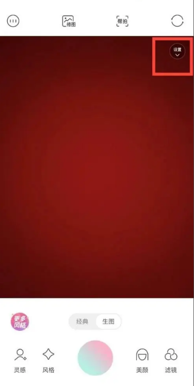 1、首先打开轻颜相机,在拍摄界面选择右上角的设置选项。