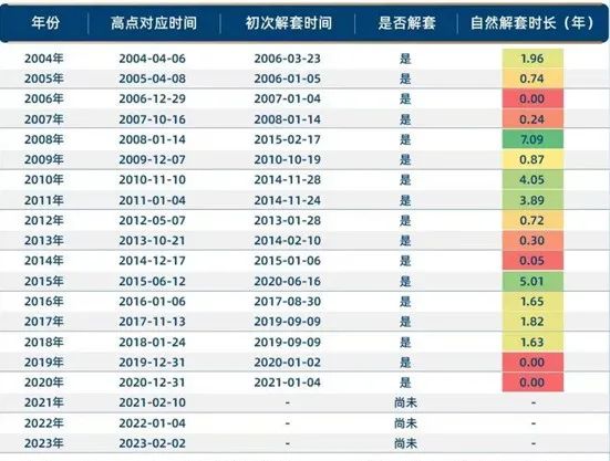 以万得偏股混合型基金指数为例,测算在历年该指数**点买入主动权益基金后“再创新高”的时长,可以发现如下规律: