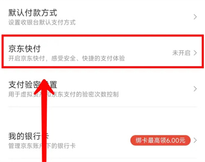 3. 接下来在支付设置界面里有一个“京东快付”,在它的后面点击“未开启”的图标进入开启。