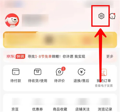 1. 打开手机中的京东APP进入后,在页面的右下角点击“我的”进入,再在我的页面里右上方点击一个齿轮形状的图标打开。