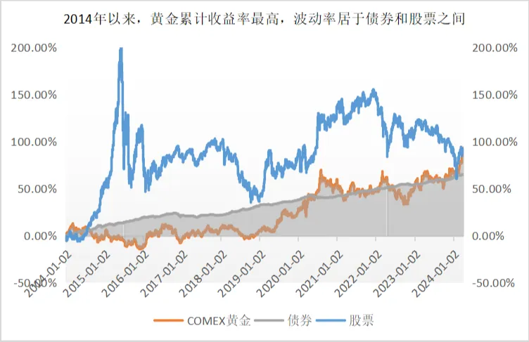 如果从近10年来看,根据Wind数据统计,COMEX黄金累计涨幅达到96.38%,折合年化收益率6.72%,从收益率曲线来看,波动较低,收益较好,堪称妥妥的稳健资产!