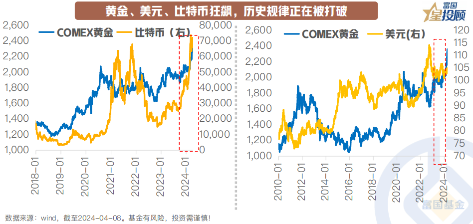 3月以**济数据超预期,全球制造业复苏预期“喧嚣尘上”,导致市场对**降息的时间点开始出现分歧。在此背景下,美元指数上涨的逻辑清晰。但与之相对应的是,金价、比特币等仍然创下历史新高,这与历史上资产轮动的规律并不符合。从偏强的经济数据看,是黄金背叛了美元。