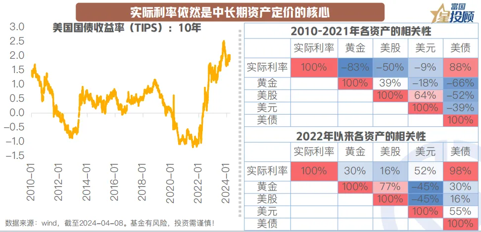 实际利率=名义利率-通货**率,是借款人真实的资金成本和**人所收到真实收益,是左右经济主体做出投资决策的决定因素。在目前通胀水平上,各类资产的持续上行需要以美债利率回落为前提,否则也会反过来再被紧货币和高利率**。中期美国降息的方向或是确定的,但过程并非“一路坦途”。当下资产可能并没有涨错,但出现了明显的抢跑。