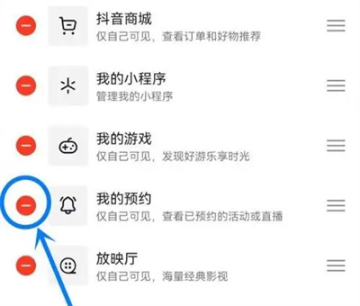 3.来到编辑服务页面后,在“展示”下方显示有当前设置的抖音主页服务列表,找到“我的预约”,在它的前面点击红色的“-”图标去删除。