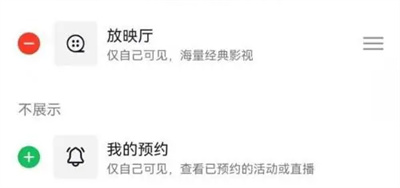 4.删除过后在下面“不展示”列表里会出现有“我的预约”,代表在抖音主页里不会显示出这个服务模块,在右上方点击“保存”退出即可。