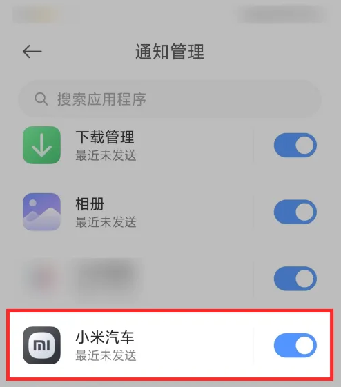3、**我们在应用里面找到小米汽车并将其后面的开关按钮开启即可!
