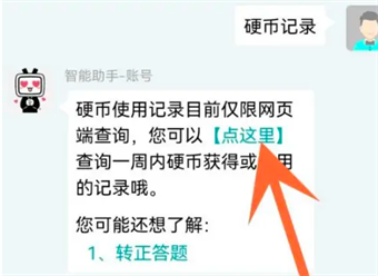 4、接着在与客服智能助手的对话栏中输出【硬币记录】查询,随后点击客服给出来的链接【点这里】。