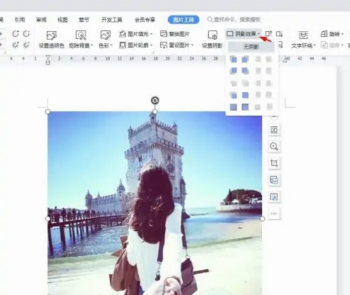 2、选中图片,在菜单栏“图片工具”中,选择“阴影效果”。