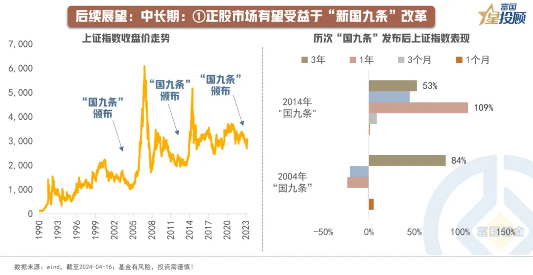 回溯历史,每一次“国九条”的发布都为权益市场带来了惊喜。其本质原因则在于制度在不断地革新和完善,从而提升上市公司的经营效率和投资者的获得感。本次新“国九条”针对上市公司从严把发行上市准入关、到严格上市公司持续监管(包括加大现金分红、回购注销等)再到加大退市监管力度方面做出了明确的要求,从供给端提升权益市场价值。同时,针对证券基金机构等相关主体行为、监管部门自身的监管,做出了全方位的布局。对运用中长期资金、其他相关各方合力推动资本市场健康发展做了系统性规划。中长期视角下,对于权益以及转债的未来表现值得期待。