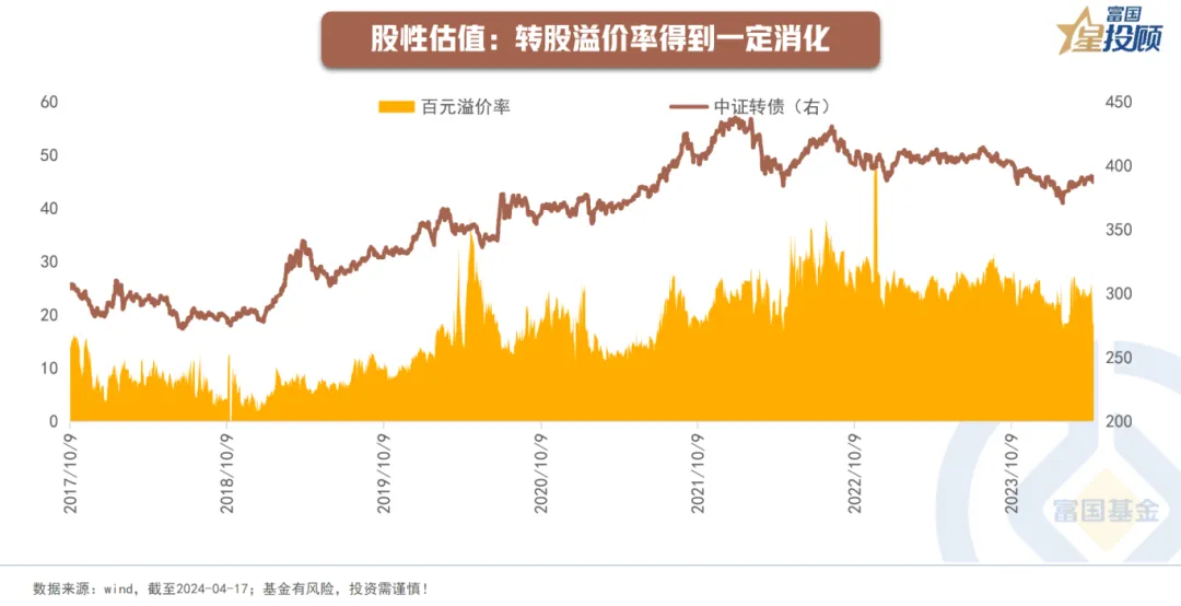过去2年,A股市场经历了较大幅度的调整,也带动了转债的调整。2022年1月5日-2024年4月17日,沪深300指数下跌了27.5%,中证转债指数也下跌了10.66%。从百元溢价率来看,已从2022年8月高点的34.49%回落至当前18.90%,估值得到了**的消化。但与2019年1月、2021年4月的底部时期比,尚有距离。