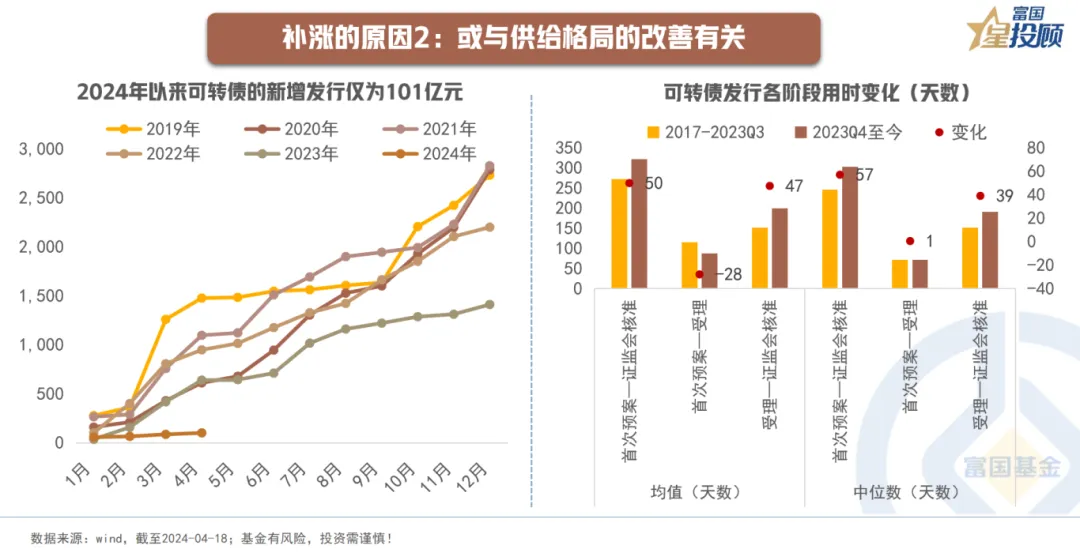 从直接的新增供给来看,2024年以来,截至4月17日,可转债的发行额仅为101亿元,显著低于往年同期水平。事实上,2023年10月以来,转债的供给预期边开始趋弱,可转债的发行所用时间已有**体现。数据显示:2023年4季度之前,**预案→证监会核准以及受理→证监会核准所需的平均时间分别为272天、152天。2023年4季度后,两者时间分别变为322天、199天,所需时间显著变长。