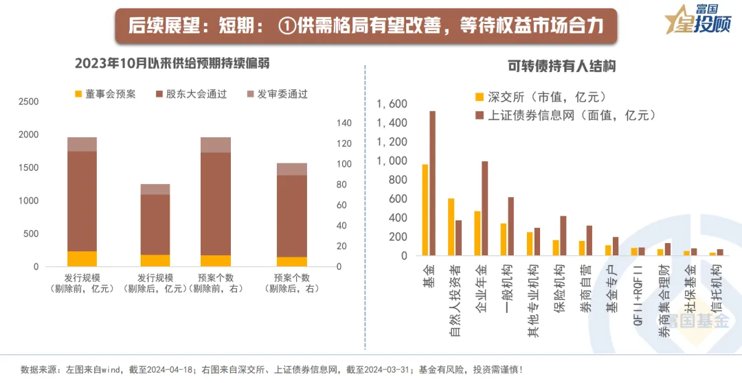 中长期视角下,对于权益以及转债的未来表现值得期待。从短期维度来看,一方面,转债趋势性行情的核心仍需看向正股市场,短期仍需更多的基本面信号验证和政策催化。另一方面,一个积极的因素在于短期的供需结构有所改善。供给端,在再融资严格审核的背景下,破发和破净转债发行或较为困难,当前待发预案剔除掉以上部分后仅剩122只转债,规模仅为1633亿元。需求端,截至2024年3月,依据深交所和上证信息网披露的转债持有者结构,基金持有占比**,随着转债估值得到**消化,在“资产荒”的驱动下,或有更多相关配置需求瞄向优质转债。此外,来自险资、年金、社保基金、信托及银行理财的资金占比也较大,在推动中长期资金的入市的过程中,或也能推升对转债的需求。
