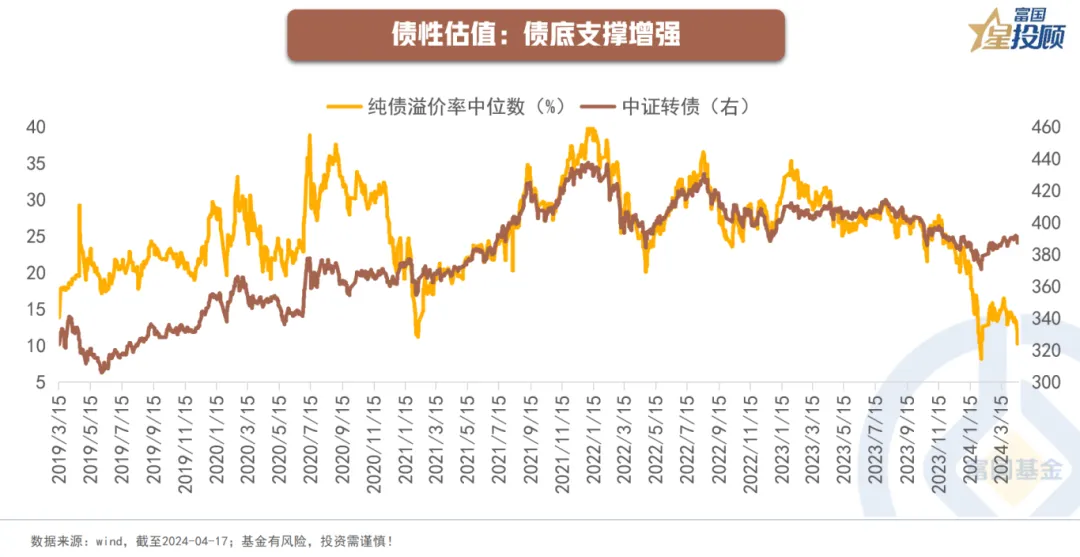 从债底对转债价值的支撑角度来看,**场转债的纯债溢价率中位数自2022年1月5日38.95%下降至当前的11.47%,债底保护效应明显增强。