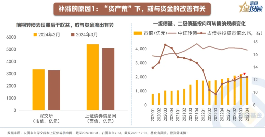 资金的改善或是本轮补涨行情的重要推动力之一。2023年5月-7月市场也出现过类似情况,即转债对应的正股陷入调整,但转债逆势上涨。而观察当时的情况,会发现资金在该期间增加了对转债的持仓。基金是当前持有可转债的重要方之一,2023年2季度末,**债基、二级债基持有的可转债规模为2087亿元,占债券投资市值比例为11.89%;而到了3季度末,持有的可转债规模变为2189亿元,占债券投资市值比例为12.38%。