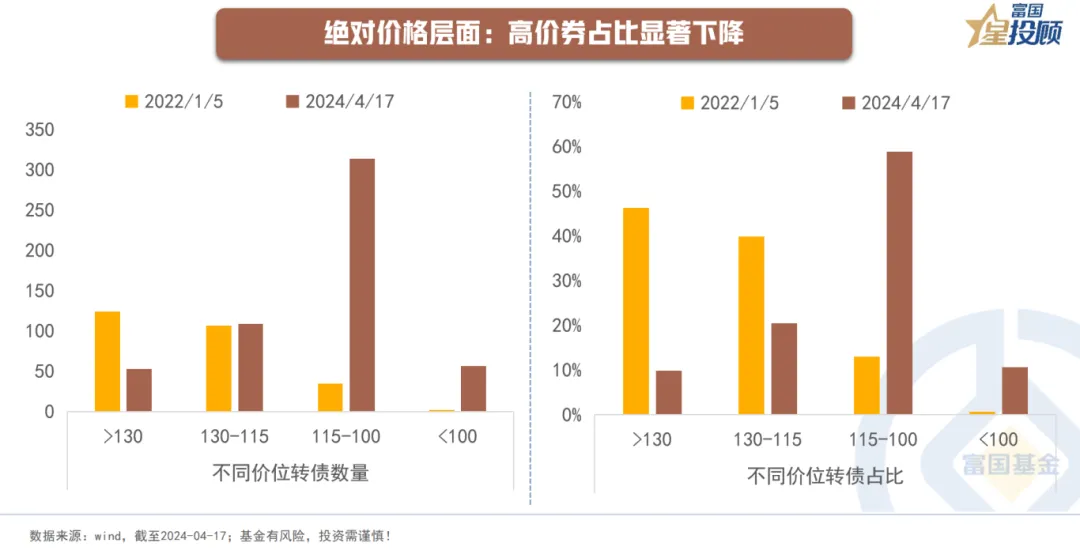 在本轮行情高点,即2022年1月初,转债价格在130以上的数量占比为46%,小于115的数量占比仅为14%。截至2024-04-17,转债价格在130以上的数量占比仅为10%,而小于115的数量占比升至70%。